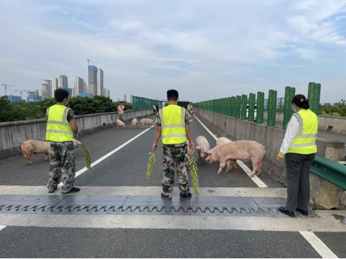 收費班長見狀后立即上報值班人員,值班人員鐘志勛第一時間將事件上報至集控點,并通知在所員工到現場開展保暢工作,高警、路政、施救養(yǎng)護單位也趕到現場展開救援清障工作。19時左右,側翻的貨車被吊起,收費人員與高警、路政對收費現場疏堵保暢,當時不少生豬因從車廂摔落受到驚嚇在高速公路上四處亂竄,收費員魏子欽、胡波、賈曉磊等多名員工在確保自身安全的前提下,絲毫不敢懈怠,寸步不離的形成“人墻”,守著這些豬豬們在安全區(qū)域一直到另一輛轉運車到達現場。在最短的時間里讓收費道口恢復暢通,收費人員并做好司乘相關解釋工作。
