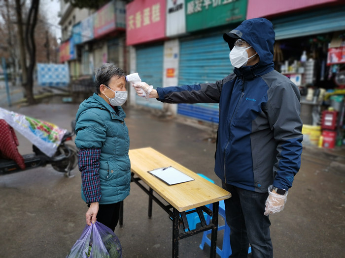 2月14日,青山區(qū)廠前街道鐵鋪嶺社區(qū)。武漢交投集團(tuán)黨員突擊隊(duì)員余皓、李慶濤早早地來到社區(qū)防控值勤卡點(diǎn)。這里是鐵鋪嶺社區(qū)平日最為繁華的菜市場(chǎng),一天忙碌的防控工作由此開始。這一天兩名隊(duì)員身兼“數(shù)職”,既要當(dāng)好疫情防控的精準(zhǔn)摸排者和科學(xué)宣教者,還要當(dāng)好措施落實(shí)過程中的耐心勸導(dǎo)者。