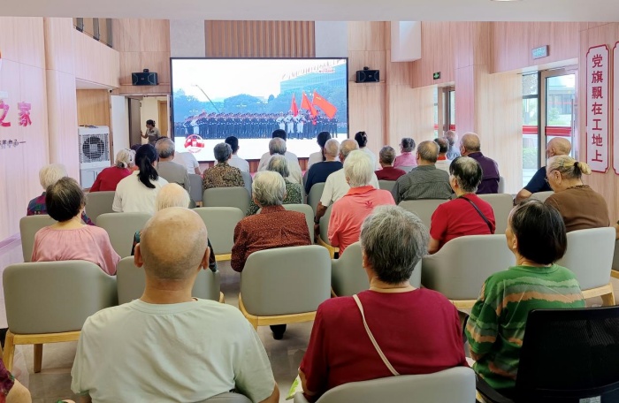活動最后,園區長者、全體工作人員共同觀看紀念中國人民抗日戰爭暨世界反法西斯戰爭勝利80周年大會現場直播。當威武的方陣邁著整齊的步伐通過檢閱臺,當嘹亮的軍歌響徹云霄,當“正義必勝、和平必勝、人民必勝”的旗幟高懸,在場人員無不心潮澎湃、熱淚盈眶。大家在莊嚴肅穆的氛圍中重溫歷史榮光,感受國家強盛的力量,更堅定了“銘記歷史、珍愛和平、開創未來”的信念。