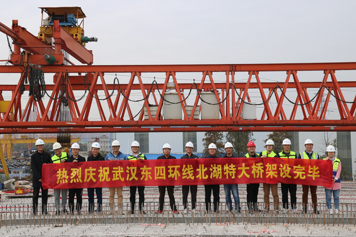 2019年11月21日上午10點58分,隨著架橋機將北湖特大橋最后一片30米長、75噸重的預制T梁精準拼裝到位,武漢交投集團東四環線高速公路北湖特大橋主橋順利實現全橋貫通,為東四環線項目“年底主線貫通”和打贏“三年攻堅”計劃奠定了堅實基礎。