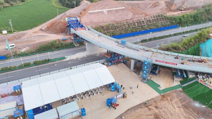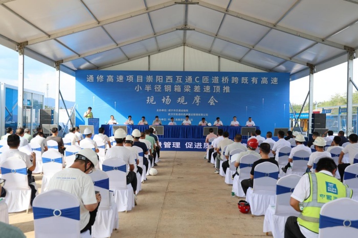 9月4日,通城至修水高速公路(湖北段)崇陽西互通C匝道橋跨既有高速小半徑鋼箱梁差速頂推觀摩會成功舉行。來自湖北省交通運輸廳工程事務中心、咸寧市交通運輸局、武漢城發集團、武漢交投集團及相關建設、設計、監理、施工單位等共百余人參加了此次觀摩交流活動,共同聚焦橋梁建設關鍵技術,探索交通工程創新發展路徑。