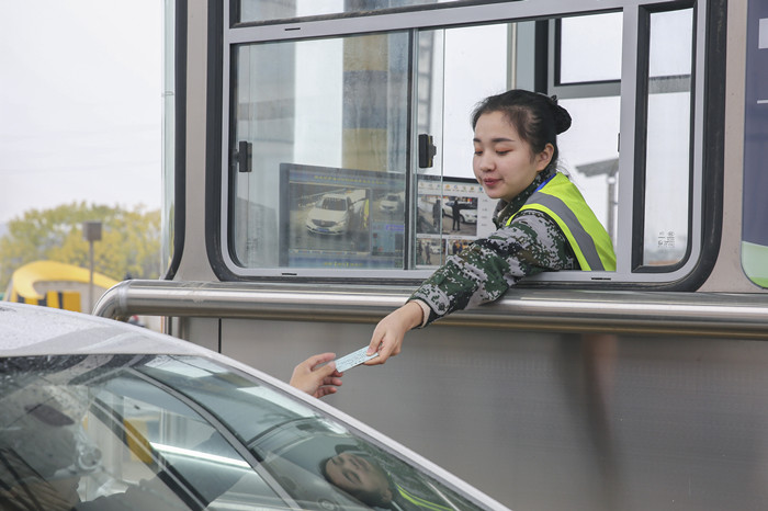 12月26日12點,收費員為駛入武深高速湖北段金港收費站的第一臺車輛發放通行卡