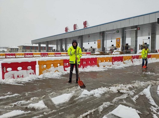 自降雪開始,各收費站的收費員們就輪番上陣,采取不間斷除雪作業法,對收費車道、島頭、收費廣場及院區等重點區域積雪進行清理,任寒風削過他們的頭發、耳朵,雙手卻沒有停過。他們只為了一個目的:避免雪勢積壓,保證道開路凈,為過往司乘提供一個良好行車環境。目前,站口車道基本清理干凈,并且有專職人員盯守,現場疏導車輛,秩序井然。
