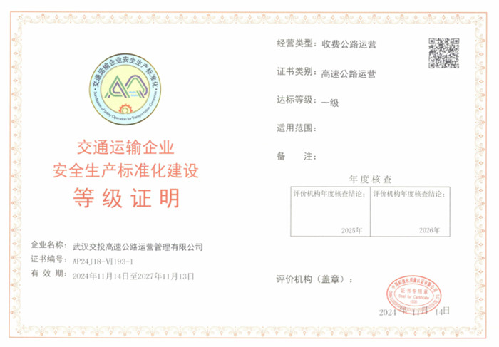 交投集團長期以來高度重視安全生產工作,始終堅持“安全第一、預防為主、綜合治理”的方針,根據《全市安全生產治本攻堅三年行動方案(2024-2026)年》部署,積極推進健全完善安全標準化體系建設,強化員工安全意識,提高本質安全水平。以此次標準化建設達標為契機,集團將持續按照交通運輸安全生產標準化一級企業的標準要求,深入開展安全生產治本攻堅行動,落細落實國務院安委會十五條硬措施、省安委會二十條實施意見、市安委會二十七條具體舉措,在城發集團安委會領導下,全面落實企業安全生產主體責任,拓展創建成果,不斷提升企業本質安全水平,努力推進集團公司高質量發展和高水平安全良性互動。