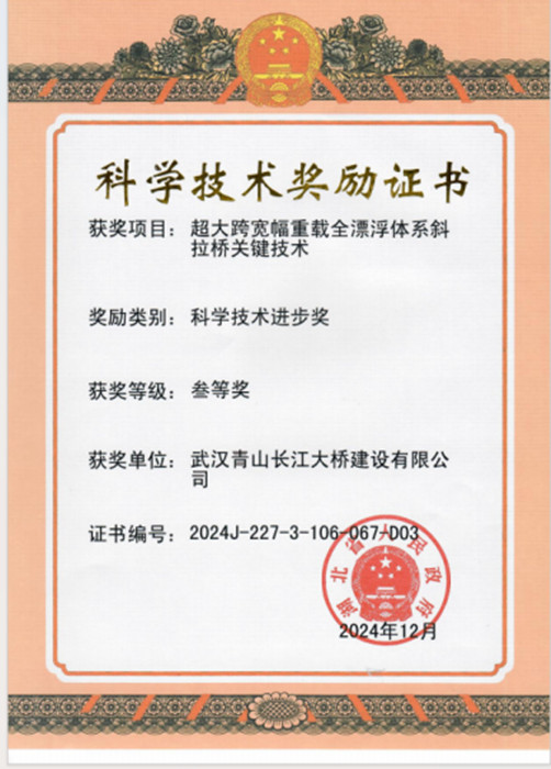 2025年1月6日,湖北省科技創新大會在武漢舉行。交投集團所屬青山長江大橋公司“超大跨寬幅重載全漂浮體系斜拉橋關鍵技術”獲得湖北省科學技術進步獎三等獎。