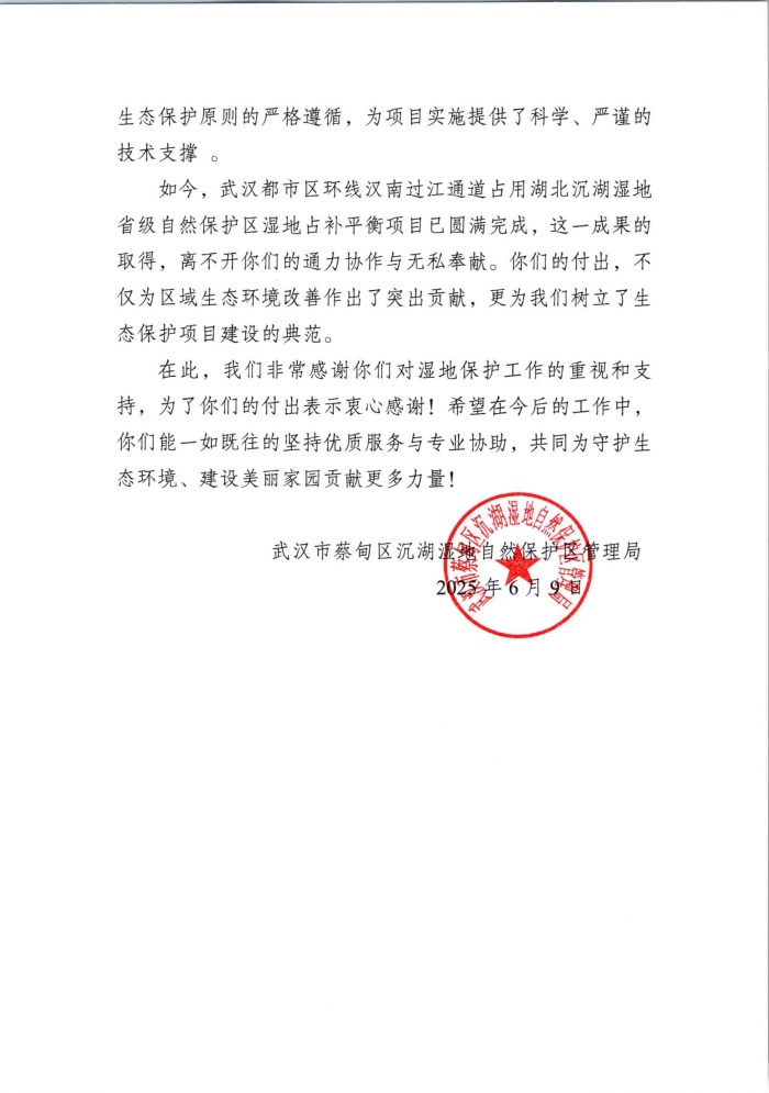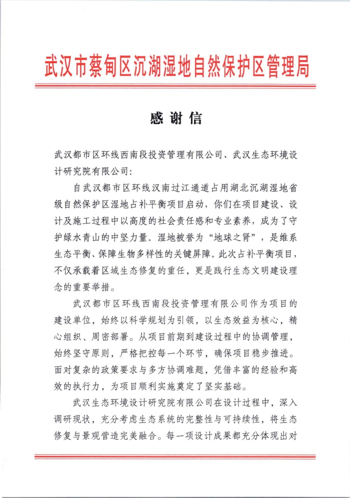 初夏六月,荷尖初露,武漢都市圈環(huán)線高速公路漢南長江大橋及接線工程沉湖濕地保護(hù)區(qū)內(nèi)蛙鳴漸起、蒲草搖曳,處處涌動著蓬勃生長的活力。在這萬物競發(fā)的美好時節(jié),項目團(tuán)隊收到了來自蔡甸區(qū)沉湖濕地自然保護(hù)區(qū)管理局的感謝信。信中特別指出,項目團(tuán)隊以科學(xué)的生態(tài)修復(fù)方案和高效的執(zhí)行能力,在重大交通基礎(chǔ)設(shè)施建設(shè)與濕地生態(tài)保護(hù)間找到了平衡點,繪就了建設(shè)發(fā)展與生態(tài)保護(hù)同頻共振的和諧圖景,為同類項目樹立了標(biāo)桿。這也標(biāo)志著該項目濕地“占補(bǔ)平衡”工作圓滿收官,在兼顧生態(tài)效益與工程可行性具體實踐路徑上又探索出了新路徑。
